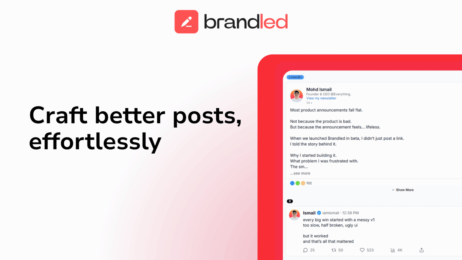 Brandled offers Voice-Aware AI that authentically sounds like you, founder-specific templates that eliminate blank-page paralysis, and scheduling tools that maintain your visibility across LinkedIn and X, enabling you to build a personal brand that attracts customers and opportunities without burnout or sounding artificial.
