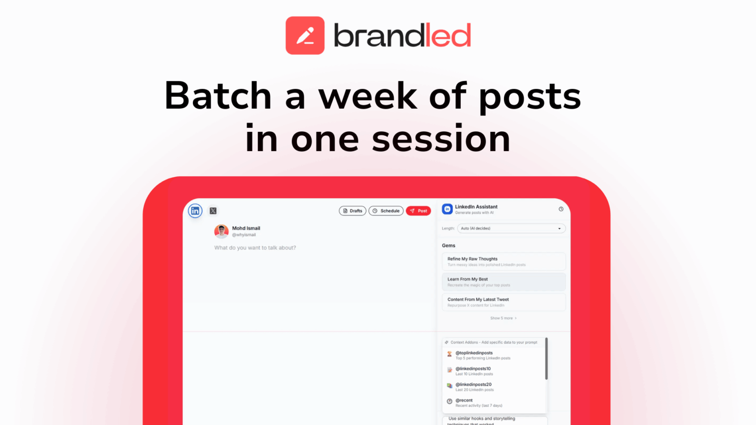 Proven Gems templates give you proven starting points for founder-specific content like launch updates, lessons learned, and building-in-public stories, while real-time previews show exactly how your post will appear on LinkedIn or X before you hit publish.
