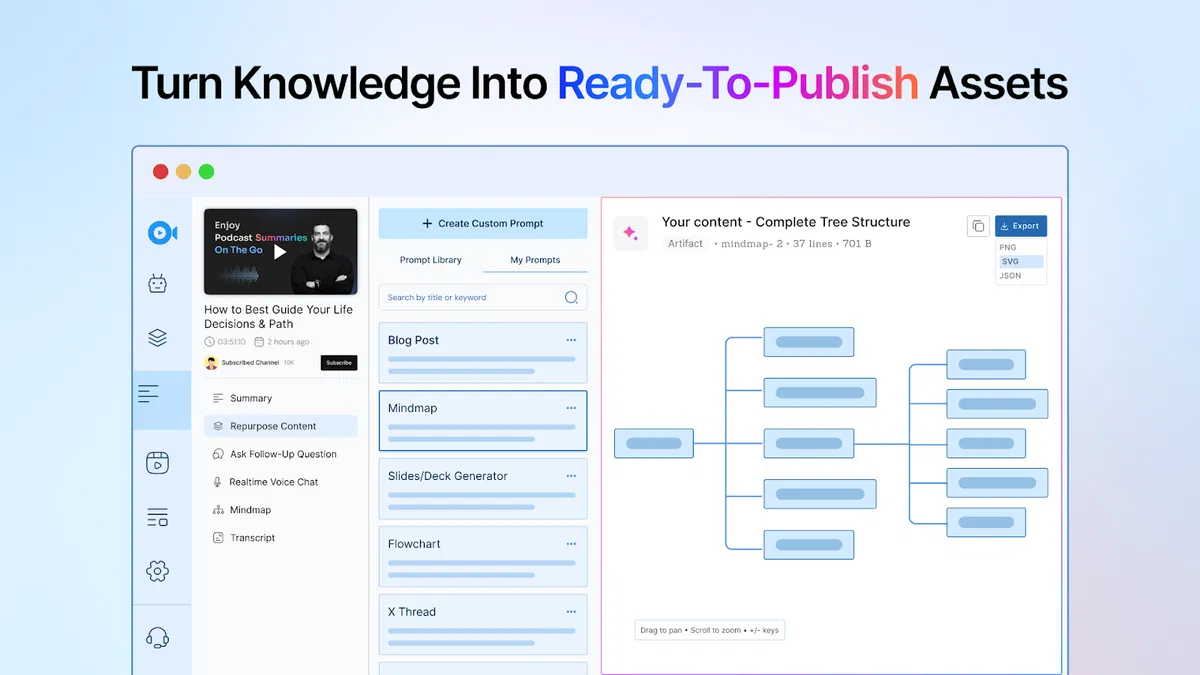 Convert videos, podcasts, PDFs, and articles into ready-to-publish blogs, threads, newsletters, and scripts.